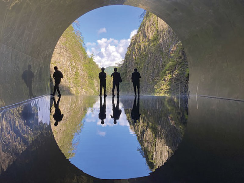 位於新潟縣十日町市的清津峽,與富山縣的黑部峽谷、三重縣的大杉谷並列為「日本三大峽谷」。雄偉壯麗的峽谷沿著清津川兩側聳立,被指定為國家名勝及天然紀念物。清津峽的誕生可追溯至1500萬年前,由於火山活動導致火山灰堆積,形成凝灰岩地層。隨後,岩漿流入與清津川的侵蝕作用,逐漸塑造出如今的壯闊峽谷。   隧道最深處的「全景觀景台(パノラマステーション)」是一大亮點,腳下鋪設的水面如鏡,映照出隧道框架內的峽谷美景,營造出神秘而夢幻的視覺效果。無論是春天的新綠、夏日的濃翠、秋季的紅葉,還是冬天的皚皚白雪,這處全景觀景台都能呈現出四季變幻的迷人風貌,因此也成為熱門的攝影勝地。