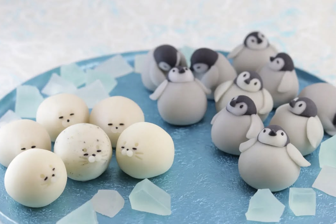 像是過去一推出就在SNS上受到廣大迴響的「南極系列和菓子」,有海豹與企鵝造型的和菓子,並用水藍色的琥珀糖來營造出南極圈的冰洋氛圍,打造出和菓子版南極圈。