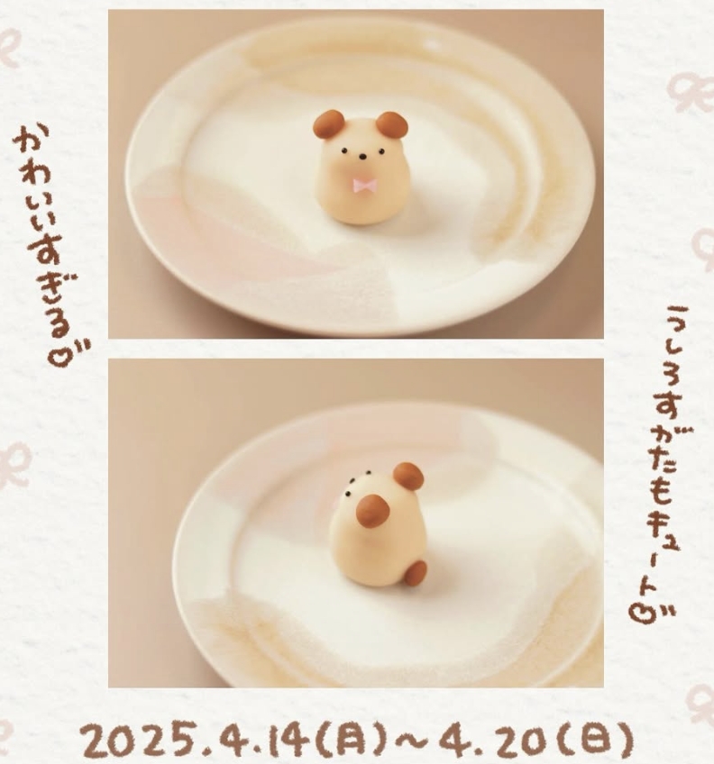 於最後梯次(4月14日~20日)登場的和菓子造型,則是由插畫家「mirin」(みりん)所繪製的小狗角色「もぷちゃぷ」,和菓子完美還原小狗的模樣,就連小狗身上的蝴蝶結細節也沒放過呢~