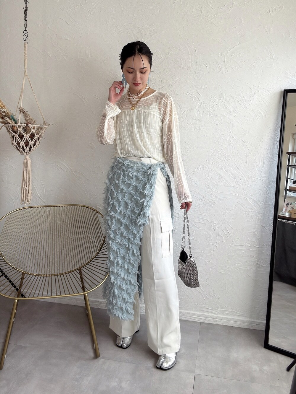 高階版透膚上衣混搭技巧,嘗試以透膚上衣 + 同色系配色巧思,比如全身奶油色單品,為整體注入一股清新明亮視覺,也可點亮好親近的鄰家感,融入寶寶藍圍裹裙,讓想表現的風格更突出,另外以全黑混搭思路,傳達中性有型的帥氣度,兩種造型轉換看起來雖然不難,但還是要著重整體和諧感,不然很容易不小心踩雷。