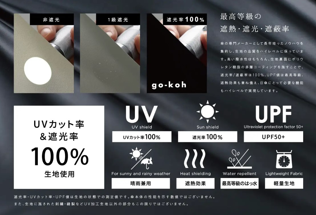 go-koh 採用 Wpc. 史上最輕量的高規格傘布 —— 15 丹尼爾的 Ripstop 遮光材質。