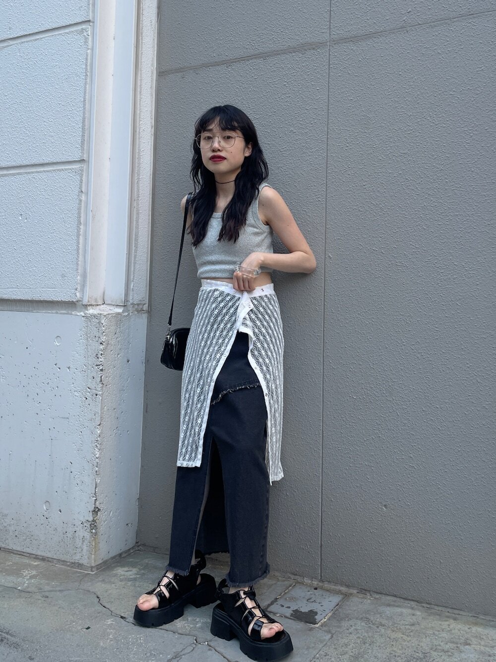 忽冷忽熱的春季,有時天氣宛如夏天般炎熱,此時透過背心、 A 字裙、蕾絲裹裙混合,運用兩件裙子的造型技巧,使整體顯得輕甜聚焦又增添層次,如果晚上變冷時,只要外搭罩衫立即展現日系個性。