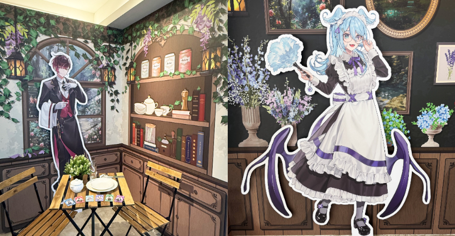 店內精心打造成如秘境般的歐式森林咖啡廳「Mystic Aroma Café」,主題佈景中擁有藤蔓圍繞的木質窗框、歐式雕花櫥櫃與夢幻華麗的佈置,彷彿是精靈與詩人聚集的地方。華麗的櫥窗與溫暖清新的色調,讓粉絲與Liver們共享悠閒愜意的咖啡時光!不僅有精緻用心的主題佈景,Liver們的身影也遍佈在店內各處,除了能看到Liver們的等身立牌外,店內也有著Q版的可愛樣貌,等著粉絲們來探索!快來現場近距離與喜歡的Liver盡情合照!
