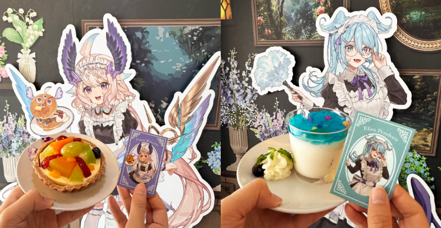 Enna Alouette的甜點「自然花園水果塔」以繽紛水果與花朵點綴,表現Enna活潑甜美的個性;「天使雲朵牛奶」使用了天使主題及溫潤的牛奶呈現Enna可愛溫暖的印象。Elira Pendora的「星辰果凍杯」則選用藍色果凍與優格,打造出夢幻氛圍。「抹茶太陽拿鐵」運用灑粉呈現太陽意象,並結合Elira喜愛的抹茶風味,帶來療癒的甜美饗宴。