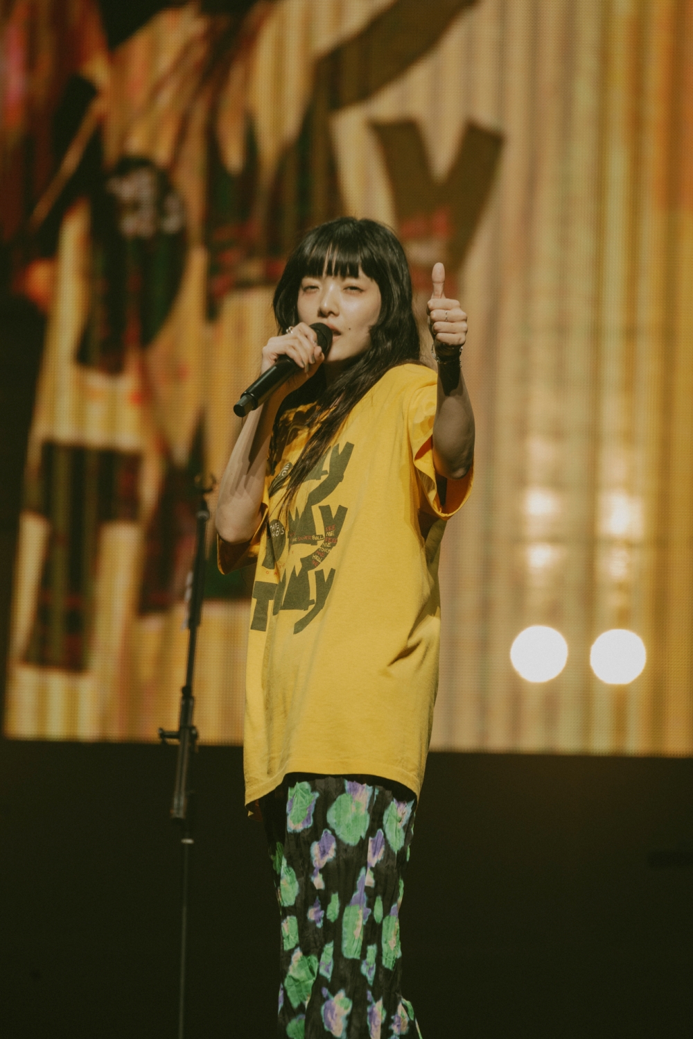 轉調後,燈光瞬切至黃橙搭配白光的暖色系,身穿黃色T恤與黑花褲的愛繆登場!一開口就是清唱,嘹亮的歌聲響徹全場,以〈反正都要死〉揭開這場既可愛又迷人的演唱會序幕。