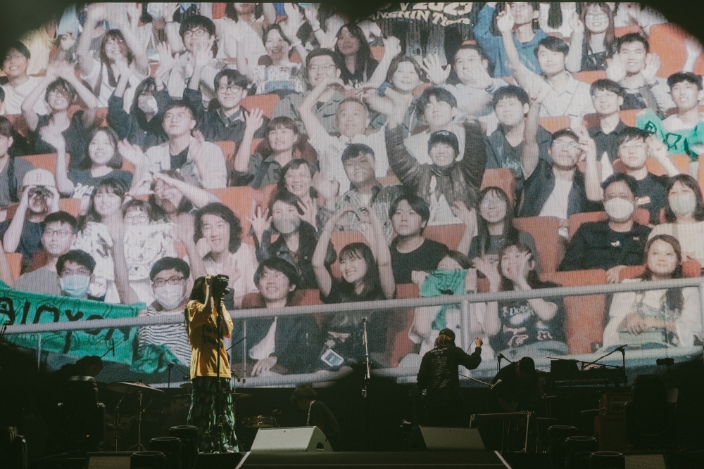 「20幾歲的觀眾好多啊,真的好年輕!看來大家都還很有精神嘛!」於是給予了大家明確的指示、希望來和觀眾進行互動的愛謬,原以為她會先點名搖滾區或二、三樓的觀眾,沒想到她發動了突襲、第一組被cue到的竟是舞台上的樂團成員,讓大家再度見識愛謬調皮又可愛的一面。