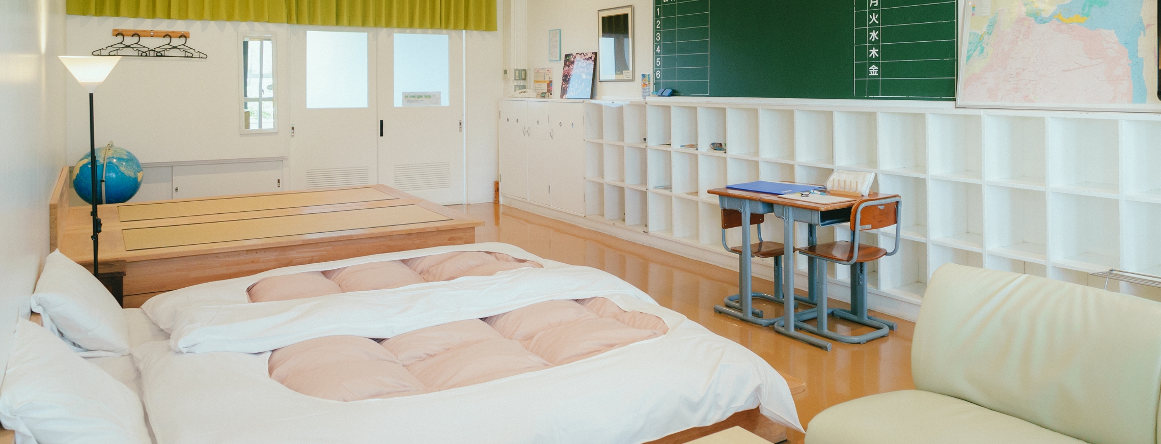 重新蛻變為道之驛的「道之驛 保田小學校」最具特色的就是體驗入住學校的嶄新住宿方式。住宿設施「學習之宿(学びの宿)」保留了黑板等舊日教室的懷舊風貌,是日本全國罕見且獨具特色的存在。每間客房都以「學習」為主題設計,讓人享受一場充滿懷舊氣息的住宿體驗。另外,也備有適合團體合宿使用的大型房間。