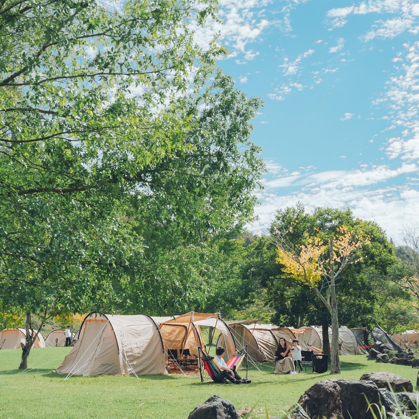 Springs Hiyoshi園內設有完善的露營場地,並提供三種尺寸的帳篷租借,可在綠意與溪流聲中體驗正統露營樂趣。