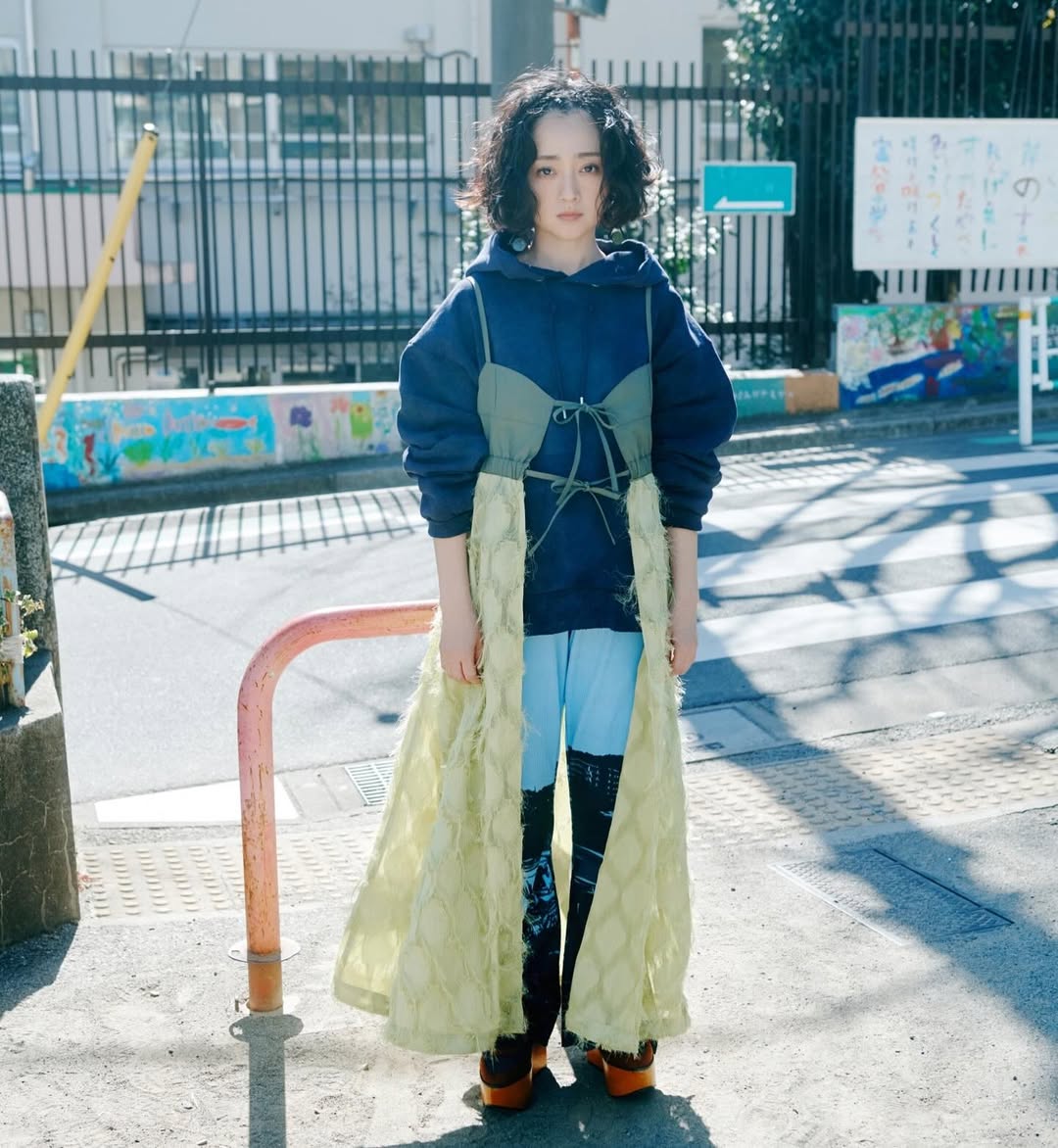 最輕鬆表達日系穿搭的方式,絕對是「多層次疊搭」,擅長透過不同單品加乘混搭的安達祐實,將此概念發揮的淋淋盡致,選擇一件連帽上衣,外加細肩帶洋裝,罩衫綁帶式剪裁,露出較多身體的面積,才不會使身型被壓縮,下身以拼接設計牛仔長褲,讓細節點亮滿滿焦點。