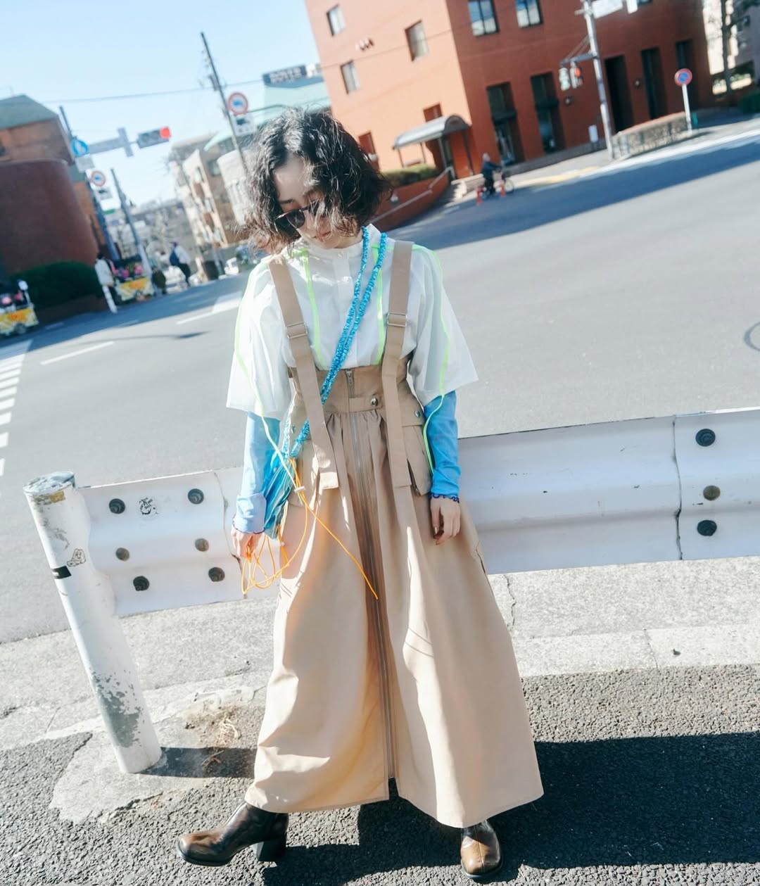 選擇圓領襯衫加卡其色吊帶褲,清新好感的裝扮,讓人感受滿滿的春夏氛圍,內搭亮藍色透膚長袖,使原本看似基本的搭配瞬間製造亮點,而高腰設計褲款,能拉長腿部纖細感,再結合安達祐實最愛的「寬」混合,打破小個子女生一往的穿衣既定印象,揹上同色側背包,立即呈現聚焦的注目度。
