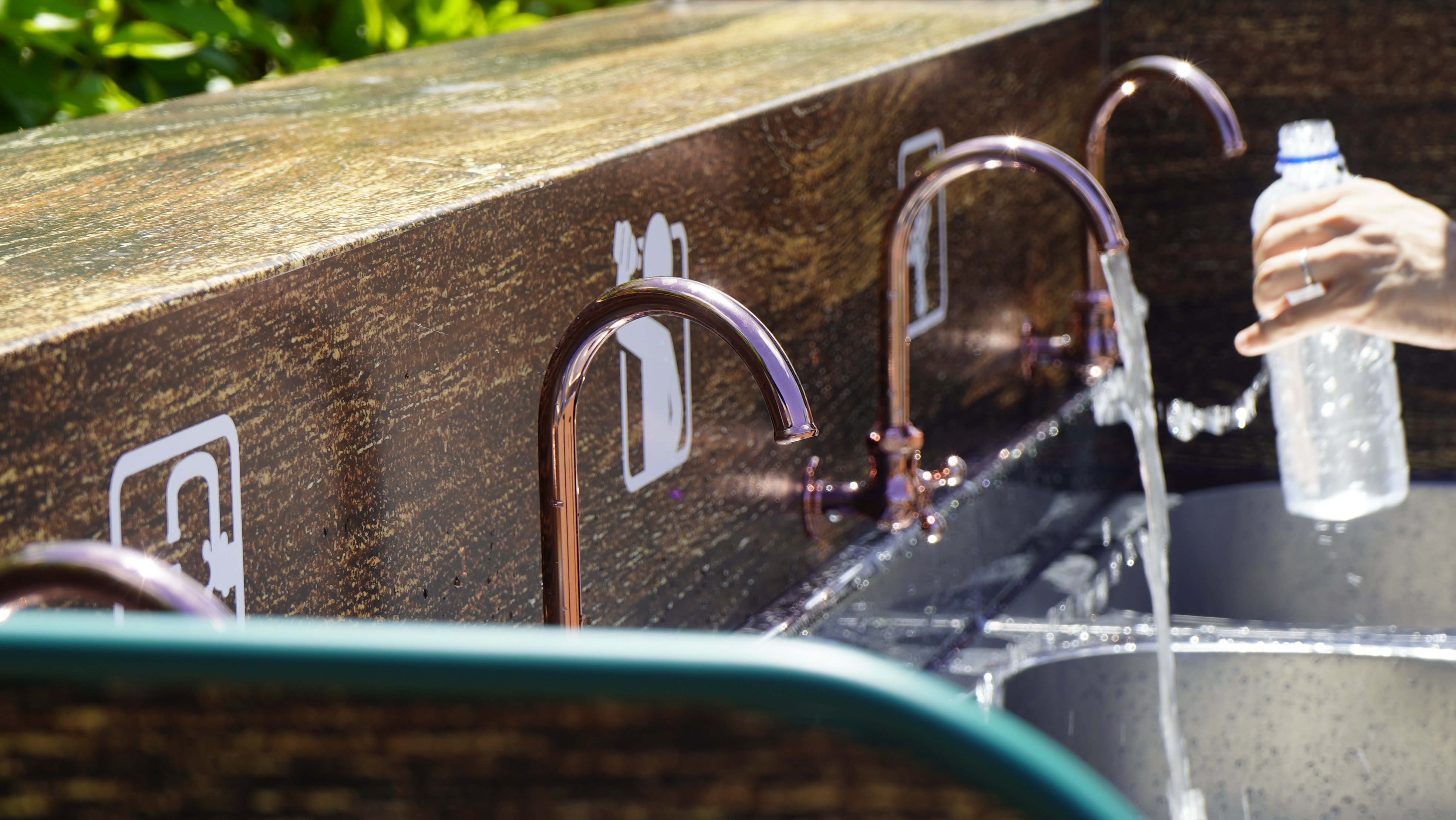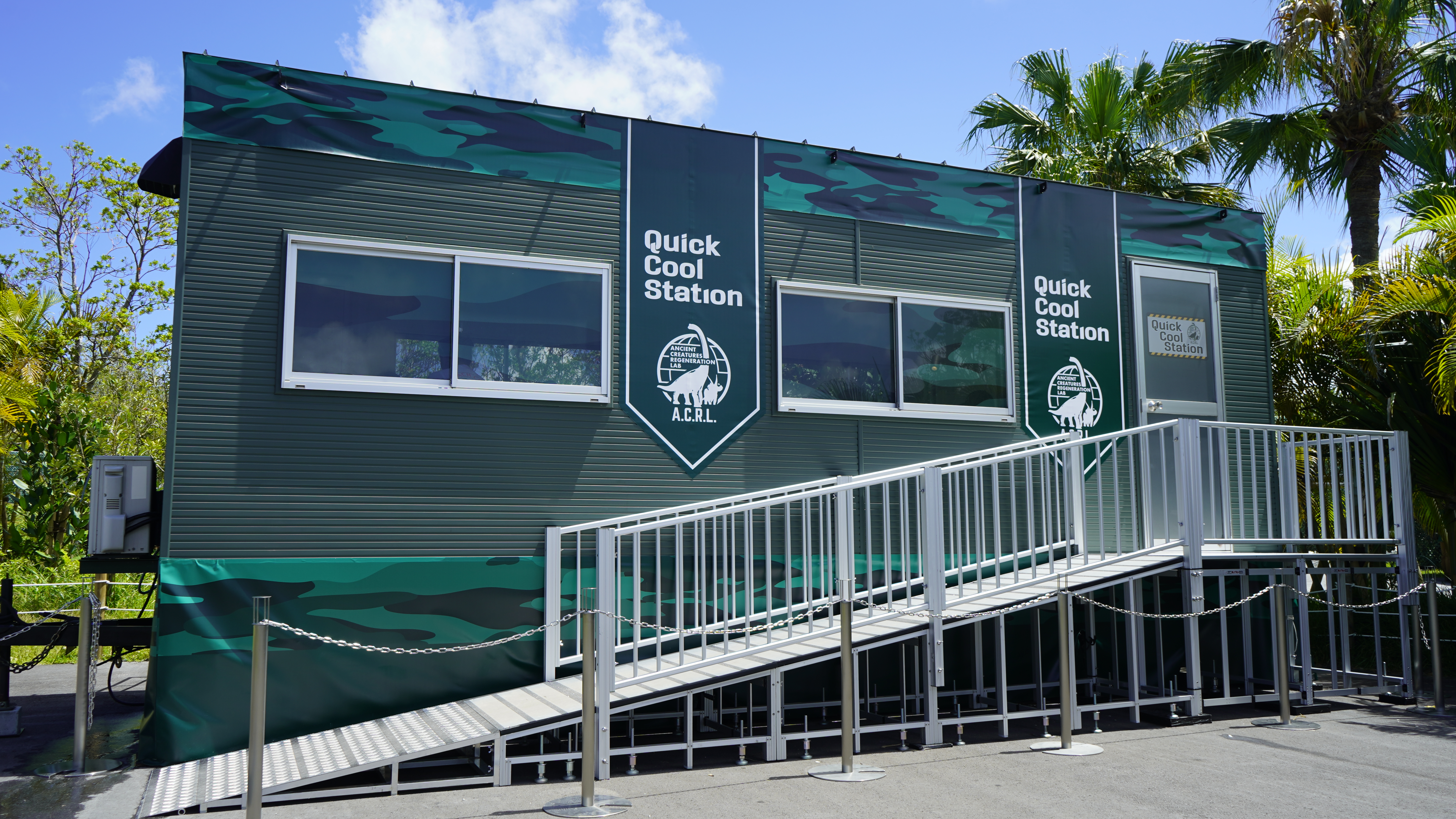 在陽光強烈、氣候炎熱的沖繩戶外樂園中,園方也推出了讓遊客能舒適遊玩的貼心服務。移動園區時,可以使用免費的陽傘租借服務借用陽傘;在遊玩設施的空檔,也能前往園內設置的「Quick Cool Station」——配有遮蔭與冷氣的休息區,或使用飲水機補充水分,一邊休息一邊享受涼爽舒適的時光。