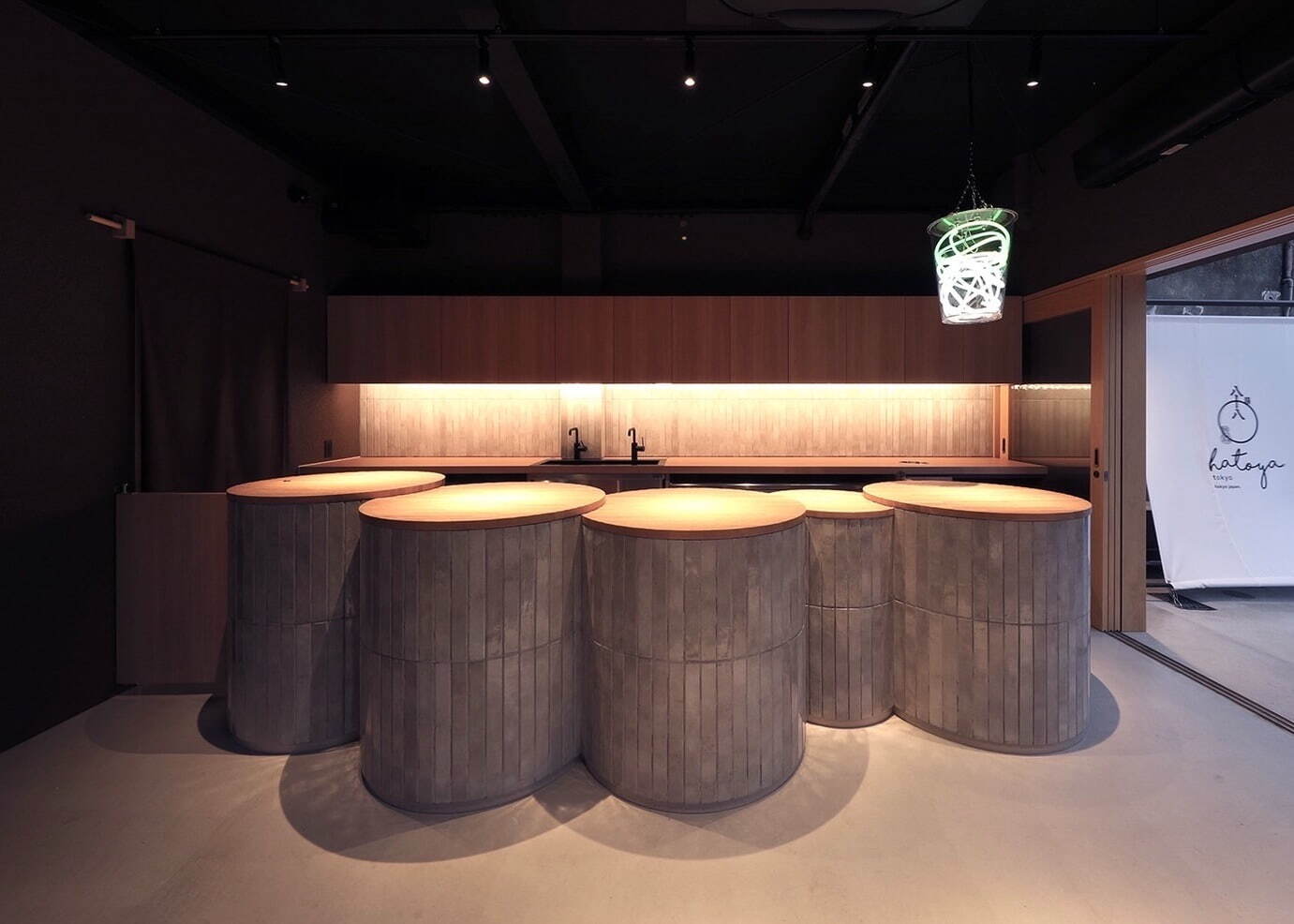 中央設置的環形中島吧台,由一根根獨立圓柱組成,檯面則使用了千利休首度納入茶室設計的「雕痕木紋(なぐり加工)」(雕痕木紋)工藝木材,細節充滿匠心。搭配品牌標誌性的霓虹燈飾「八十八」字樣,讓傳統與現代在空間中優雅交融,無論是靜靜品茶還是享用甜點,都能感受到茶道文化的當代詮釋。