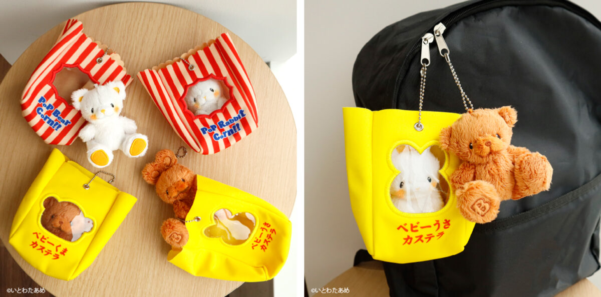 款式方面則是扭蛋第一彈加上第三彈的設計,卡斯特拉蛋糕與爆米花造型,登場的玩偶則是熊熊與兔兔,掛掛包包上療癒又可愛。