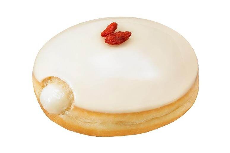 首先要介紹的是這款「杏仁豆腐」甜甜圈,簡直就是中式甜點愛好者的夢幻逸品!內餡使用了如杏仁豆腐般滑嫩的杏仁奶霜,整體包裹在純白的白巧克力中,外層再塗上帶有光澤的杏仁風味糖漿,最後點綴上鮮豔的枸杞作為裝飾。一口咬下,杏仁豆腐特有的甘甜溫潤口感在口中綻放,彷彿置身於高級中式茶樓般的奢華享受。
