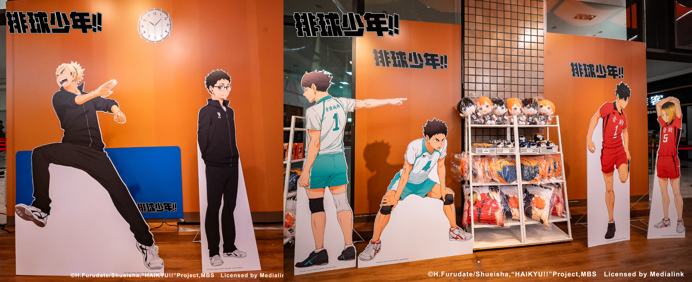 一出電梯口,遠遠就能看見快閃店主視覺在門口,看進門內,咦!怎麼會有人在店內打排球?原來這次快閃店把立體排球場帶進展場啦!看日向、影山高飛殺球,月島攔網等十位烏野高中選手的英姿,想一睹熱血沸騰的比賽就來這!只有球員還不夠,教練烏養及顧問武田也在一旁,旁邊還有青葉城西的及川與岩泉,和音駒主力黑尾與孤爪。