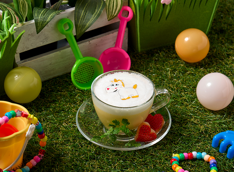 以獨角獸小奶油為靈感的香濃奶油風味奶昔,並搭配象徵牠心形圖案的草莓點綴。