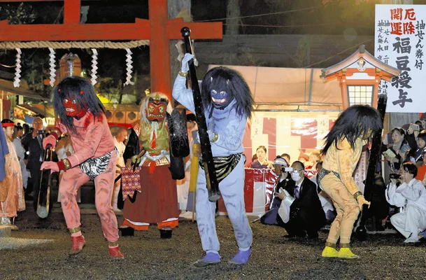 吉田神社節分祭與一般的節分不同,並不使用灑豆子來驅鬼,而是扮演真正的巫師「方相氏」,來驅逐會場內的赤鬼、青鬼以及黃鬼,讓場面顯得熱鬧非凡。除此之外,在祭典期間也會有許多攤販前來擺攤,讓前來參加祭典的眾人,都能夠開開心心的迎接春天的到來。