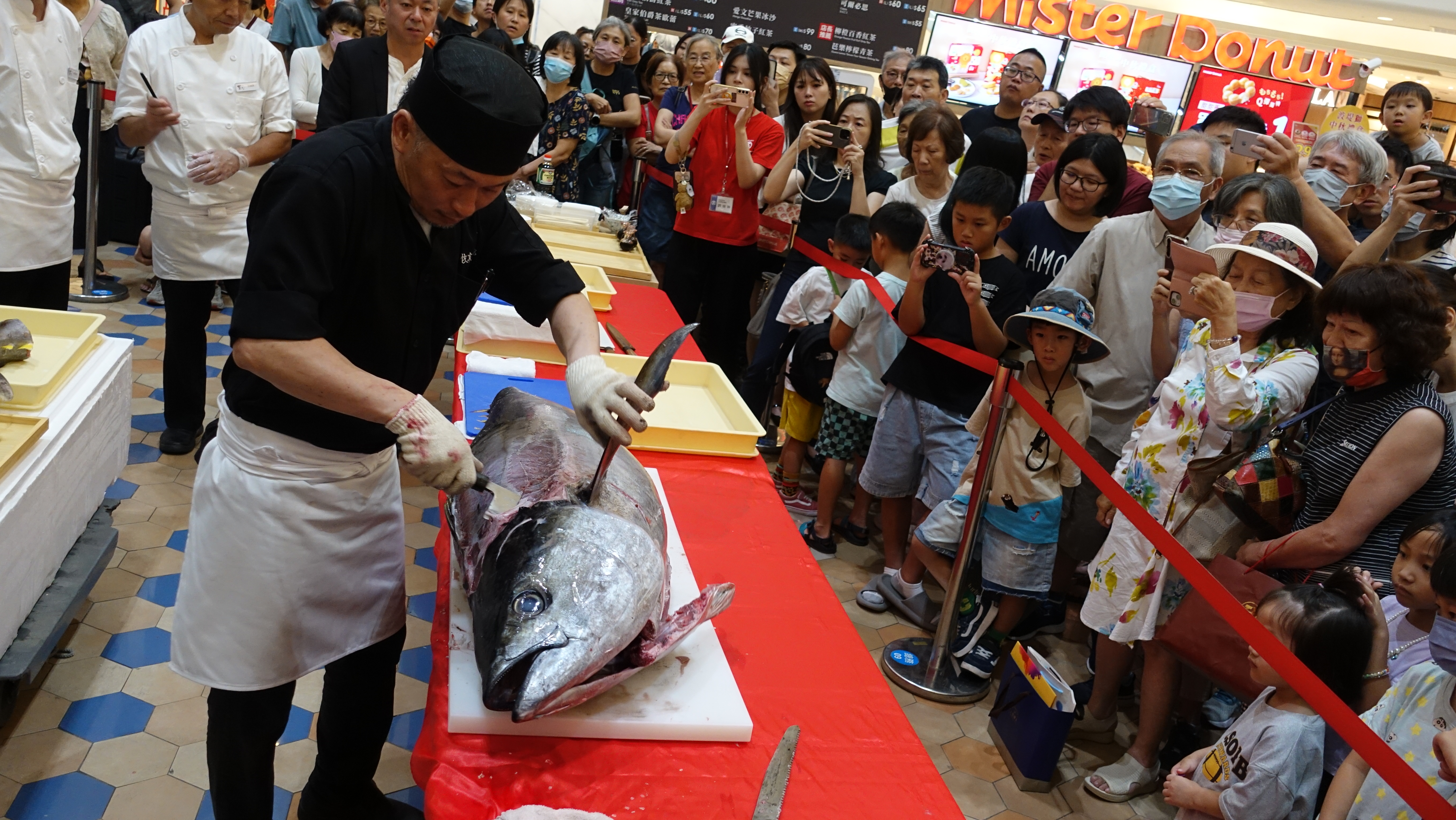 菜な nana開幕前夕在大葉高島屋B1廣場舉辦鮪魚解剖秀,吸引民眾駐足