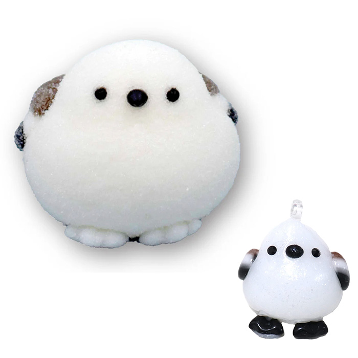 有雪精靈之稱的北長尾山雀,其白皙的身軀與棉花糖的形象非常搭,小巧圓滾滾的模樣,雖然知道這是棉花糖,還是會讓人捨不得吃下肚。組合內的同款吊飾也相當吸引人,這樣的組合搭配直叫人好想收藏!