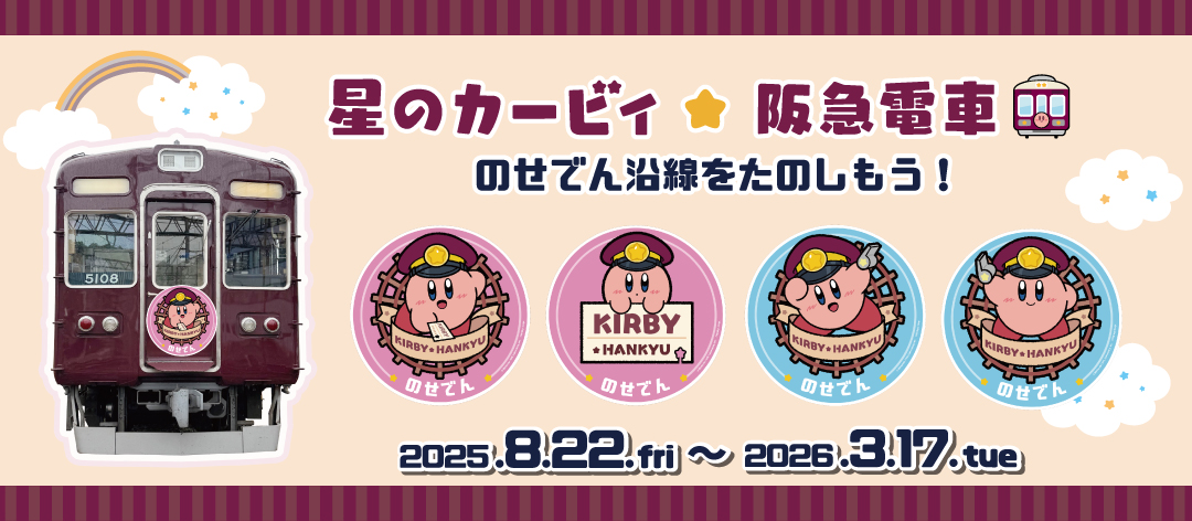 2025 年 8 月 22 日(週)至 2026 年 3 月 17 日(週),阪急電鐵將攜手超人氣遊戲《星之卡比》展開一場萌度爆表的夢幻合作!活動期間,神戶線、寶塚線與京都線將有可愛滿點的「卡比號」彩繪列車奔馳上路,帶領乘客踏上粉紅魅力之旅。