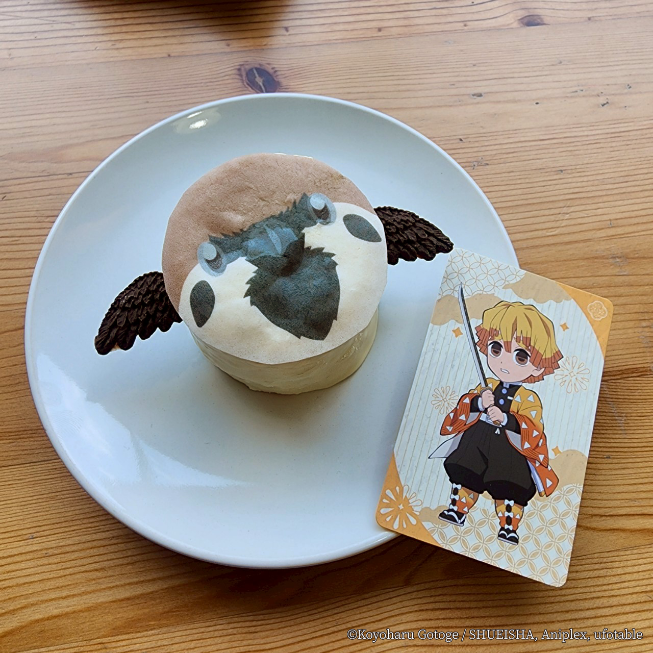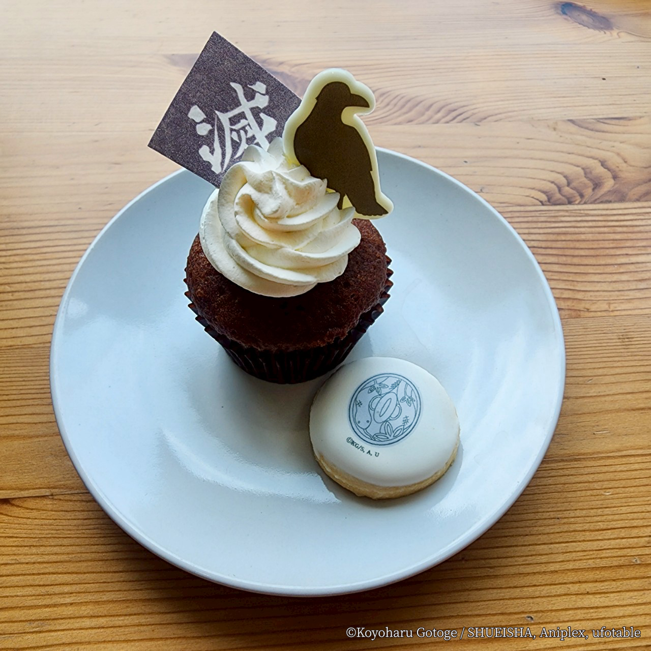 「鎹鴉巧克力杯子蛋糕」,濃郁巧克力杯子蛋糕搭配造型巧克力片,彷彿聽見鎹鴉傳達任務指令(贈隨機糖霜餅乾1片,共7款)。