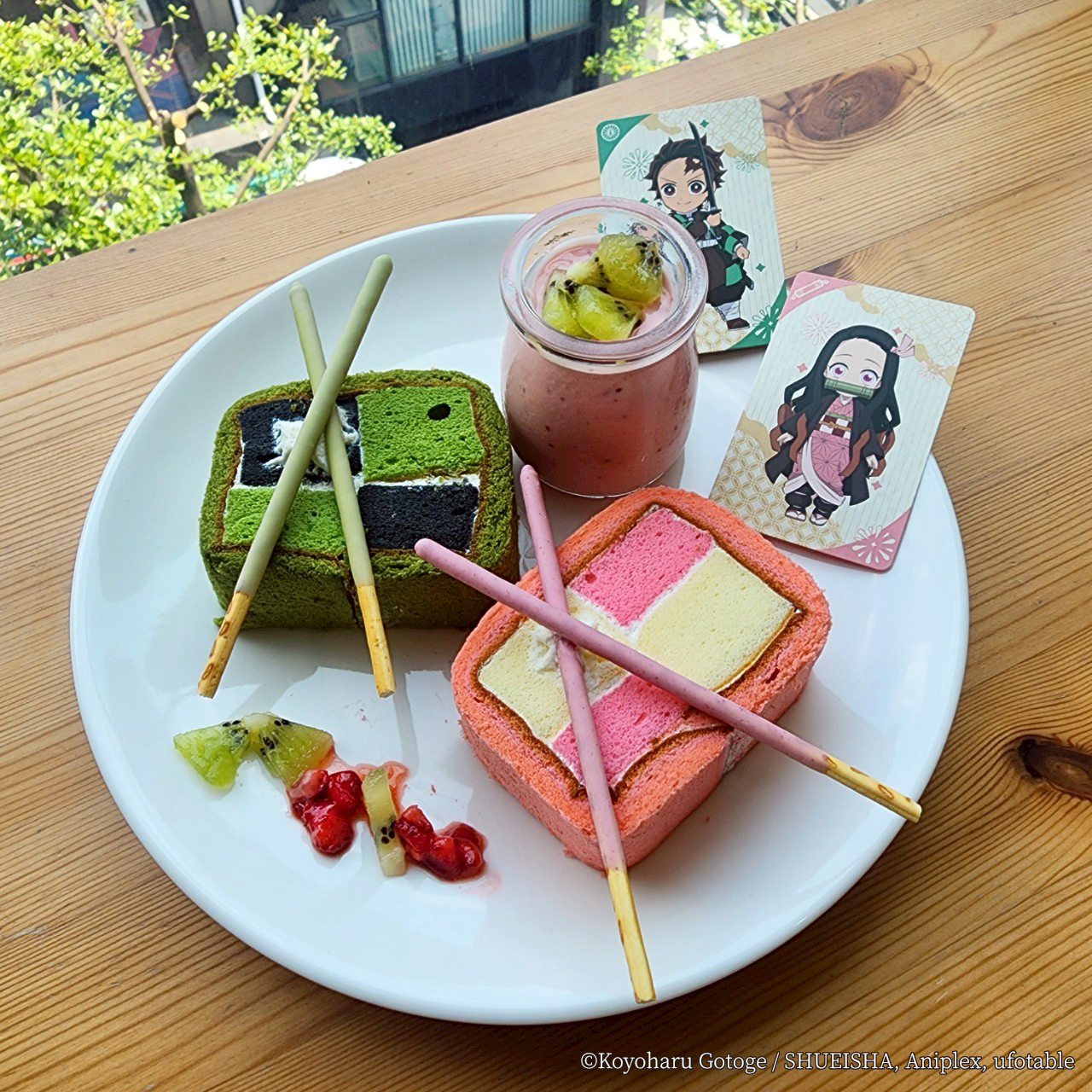 還有四款造型吸睛的甜點,「竈門兄妹的點心拼盤」,棋盤切片蛋糕、草莓抹茶巧克力棒與優酪乳水果杯,展現兄妹溫暖有朝氣的印象(贈指定小卡2張)