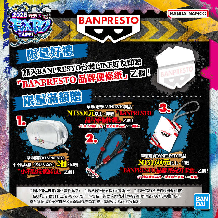 滿額禮:錢包君準備好了嗎!單筆購買NT$800元以上BANPRESTO商品,即贈品牌手機吊繩,購買NT$1,600元以上,即贈品牌壓克力卡套乙個(以上皆不含活動限定品、搶先販售商品、一番賞)。
