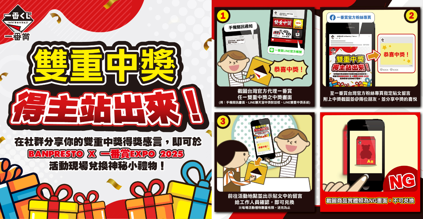 雙重中獎站出來:只要在指定貼文留言中附上雙重中獎截圖並@兩位朋友,即可在活動現場兌換神秘小禮物,每場活動禮物數量有限,送完為止!