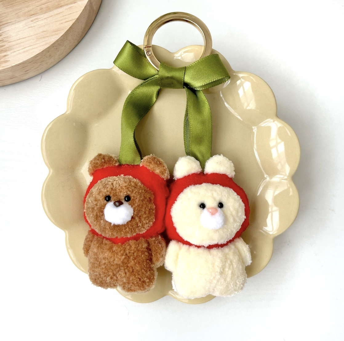 還有這款櫻桃熊與兔子的造型吊飾,這是將兩片俄羅斯刺繡的布面縫合在一起所製作出來的喔!而且熊與兔子其實是各自分開來的,之所以看起來會連在一起,那是因為有在裡面藏磁鐵,讓兩隻動物可以彼此吸附在一起。