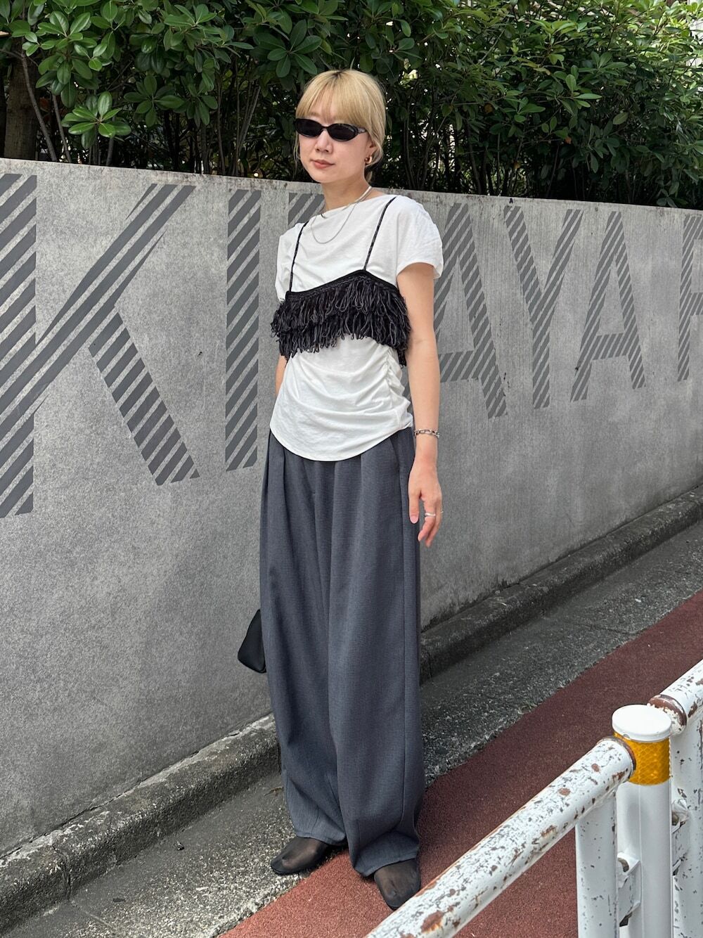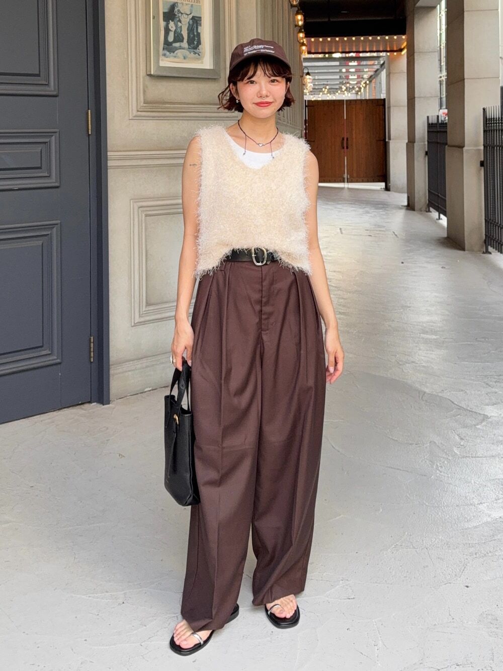 適合夏季穿著的乾爽針織面料,結合寬圓領設計,能修飾肩膀與脖子的纖細感受,運用短版背心與休閒西裝褲加乘,營造率性兼具的質感氛圍,當進入換季時,只要換上帶點秋天的羽毛流蘇背心,便可製造同樣的衣著效果。