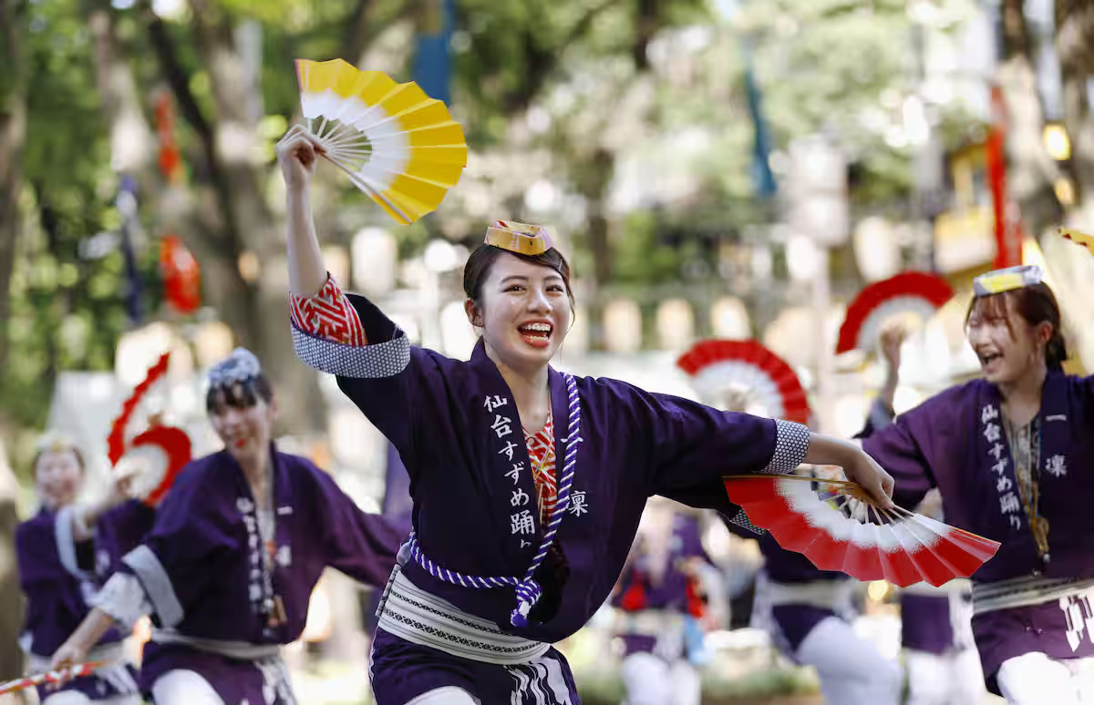在青葉祭上,人們會一同跳著仙台的傳統舞蹈「仙台雀舞」一邊在仙台市街上遊行,隊伍中還有包括花車與音樂演奏一同參與,讓仙台市在歡快的氣氛下迎接初夏的到來。除此之外,在其他天也有著武士們率領著高大山車前進的時代繪卷遊行,加上伊達政宗的盔甲與仙台工藝品等等,是一場能充分感受仙台特色的祭典。
