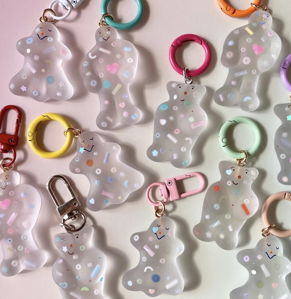擅長以樹脂與石塑黏土等媒材來進行創作的「kosokoso」,能在其作品之中看到不少花器、擺飾或是戒指、胸針等飾品,他的用色風格帶給人一種柔和舒適的氛圍,在保有透明感的同時,又帶有一點霧面感,甚至還會在裡面填充一些繽紛的裝飾亮片或串珠,打造一種透明又帶有繽紛色彩的迷人風格。