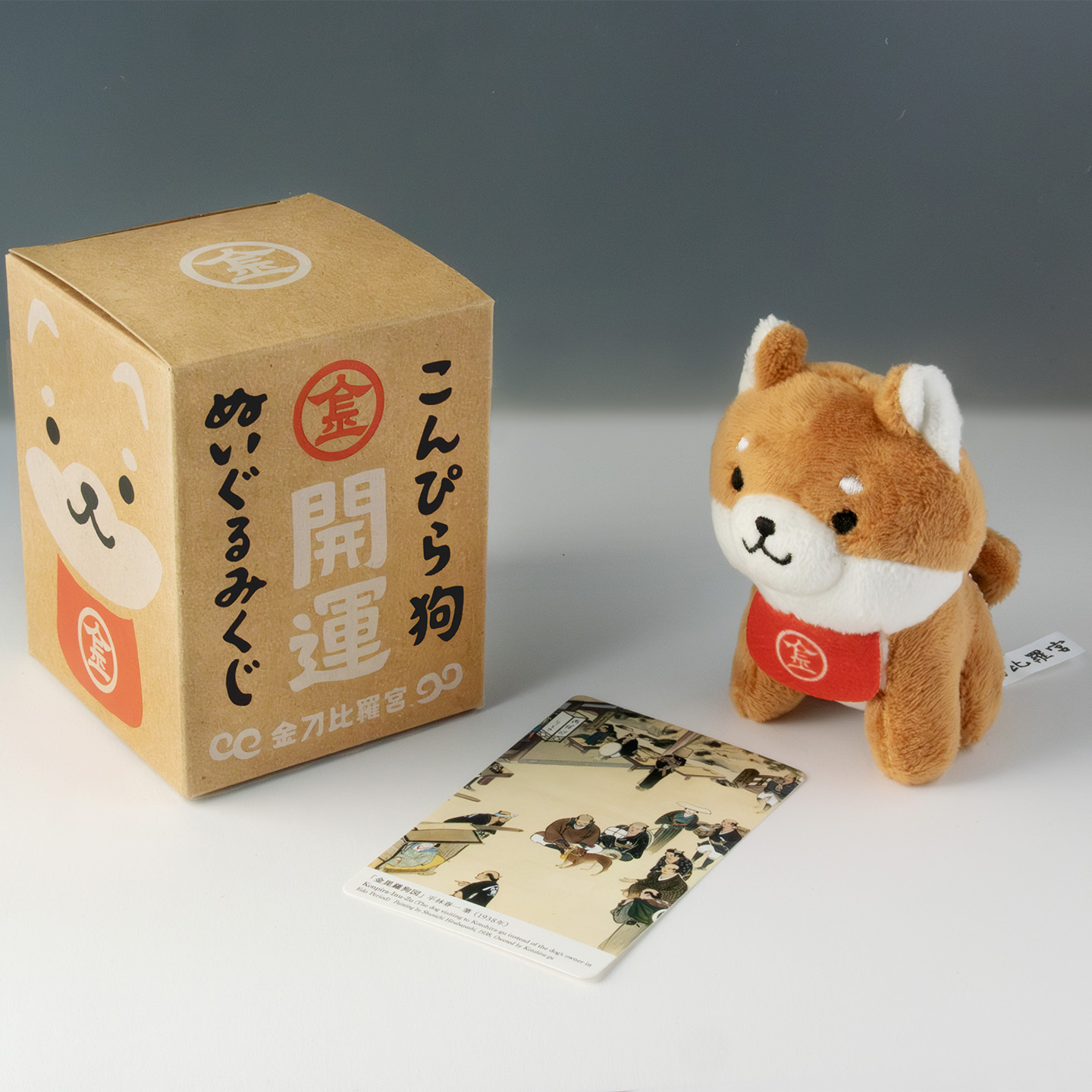 相傳在江戶時代,對於庶民來說一生一定要朝聖一次的神社,其中一座便是金刀比羅宮,然而前往參拜的旅途遙遠,有些人無法親自抵達,便會在途中付錢委託他人代為參拜,而這個任務可不是只有人類能勝任,在此處甚至還流傳著飼主交由狗狗代為參拜的習俗,這個狗狗玩偶神籤便是以這樣的「代參犬」為形象所打造而成的。