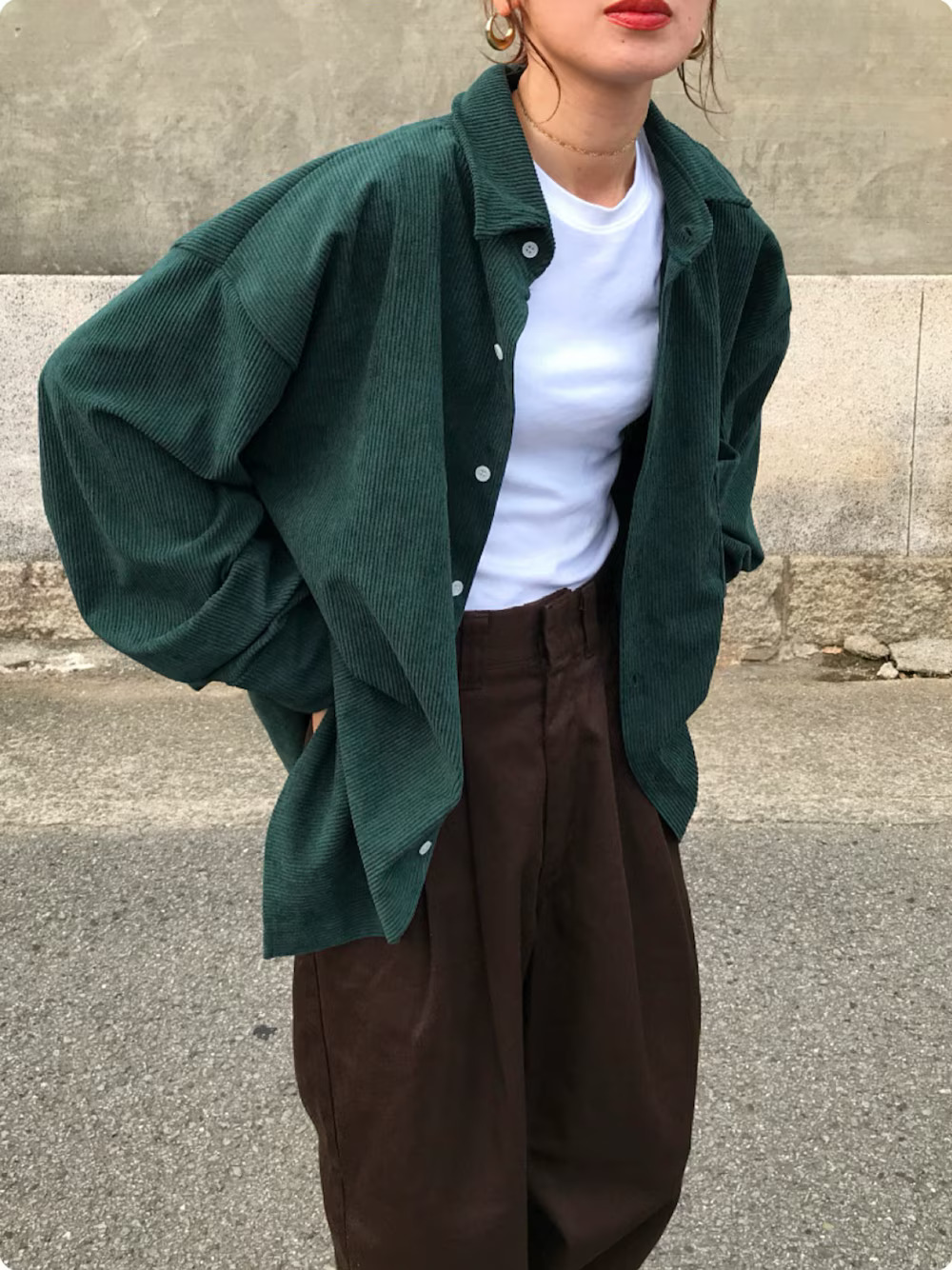 當想營造中性風時尚的話,嘗試以草綠色單品為造型,例如燈芯絨襯衫、短版風衣都是充滿秋氛感受的單品,融入大地色下身混合,瞬間呈現低調又帥氣的日系氣息。