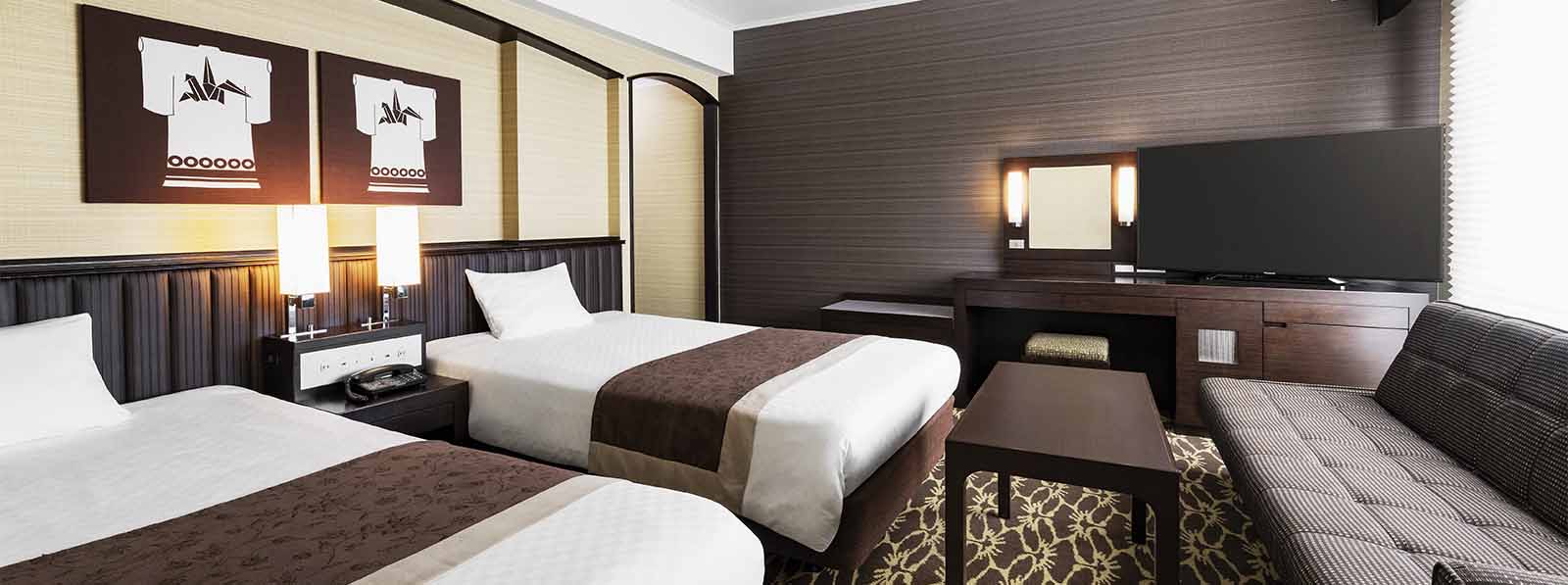 客房內以京都傳統色紙與織物:唐紙與西陣織紋樣裝飾,呈現出滿滿古都感。飯店內餐廳口味選擇多元,不同季節還會推出限定菜單與吃到飽活動。全部客房皆有免費Wi-Fi可連接,另可與飯店租借電腦使用。周遭有三十三間堂、銀閣寺、東本願寺等知名景點,適合攜帶家人一同居住。相信喜愛人文歷史的住客,在這裡住宿也能逛得滿足。