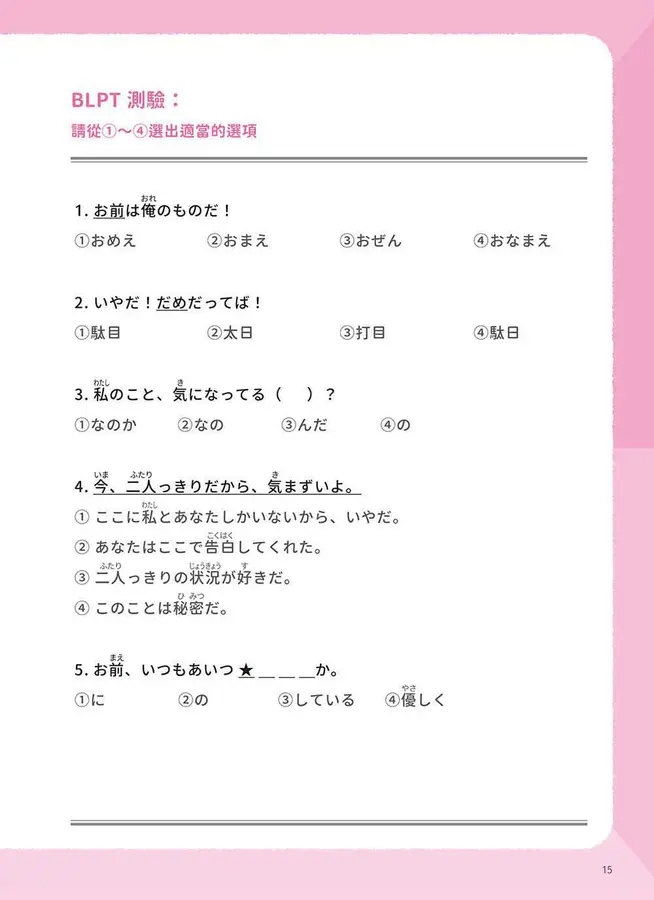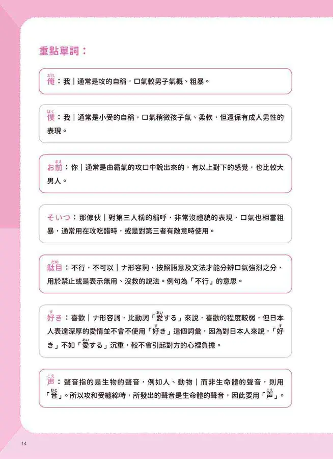 如此新鮮的日語教科書,相信讀完以後能加快吸收不少日語戀愛作品。喜歡BL作品的腐男女們,就用這本《BLPT耽美日語文法檢定: 必考! 30個最令人臉紅心跳的耽美句型!》幫助學習吧!