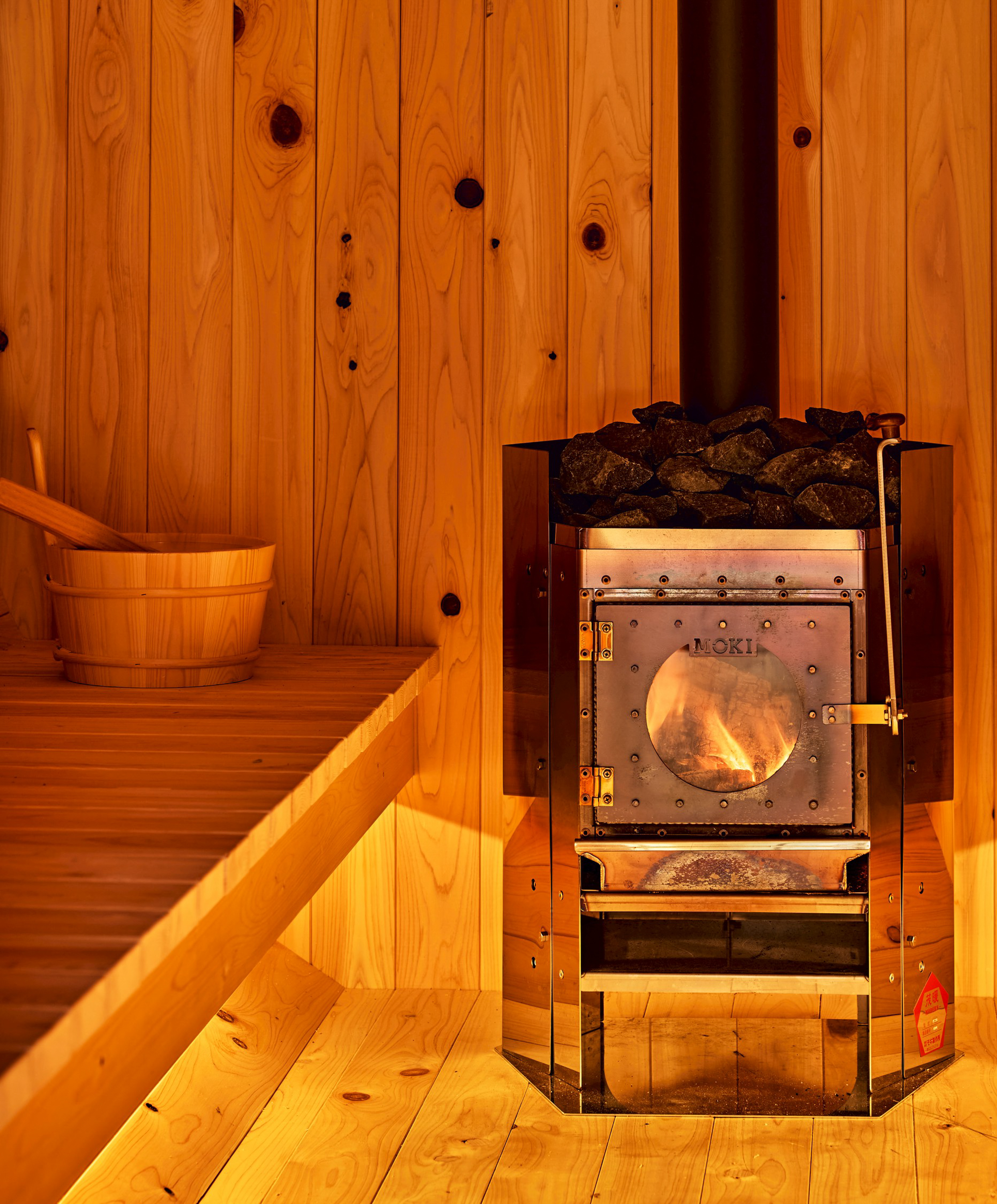 桑拿區以木製平台鋪設,可赤腳自在行走,觸感溫潤舒適。這座桑拿最高可達110度,使用者可自行進行「セルフロウリュ」(自行將水潑灑在熱石上產生蒸氣),以此增加熱氣與濕度,同時體驗強烈的熱能與舒暢的清涼感。