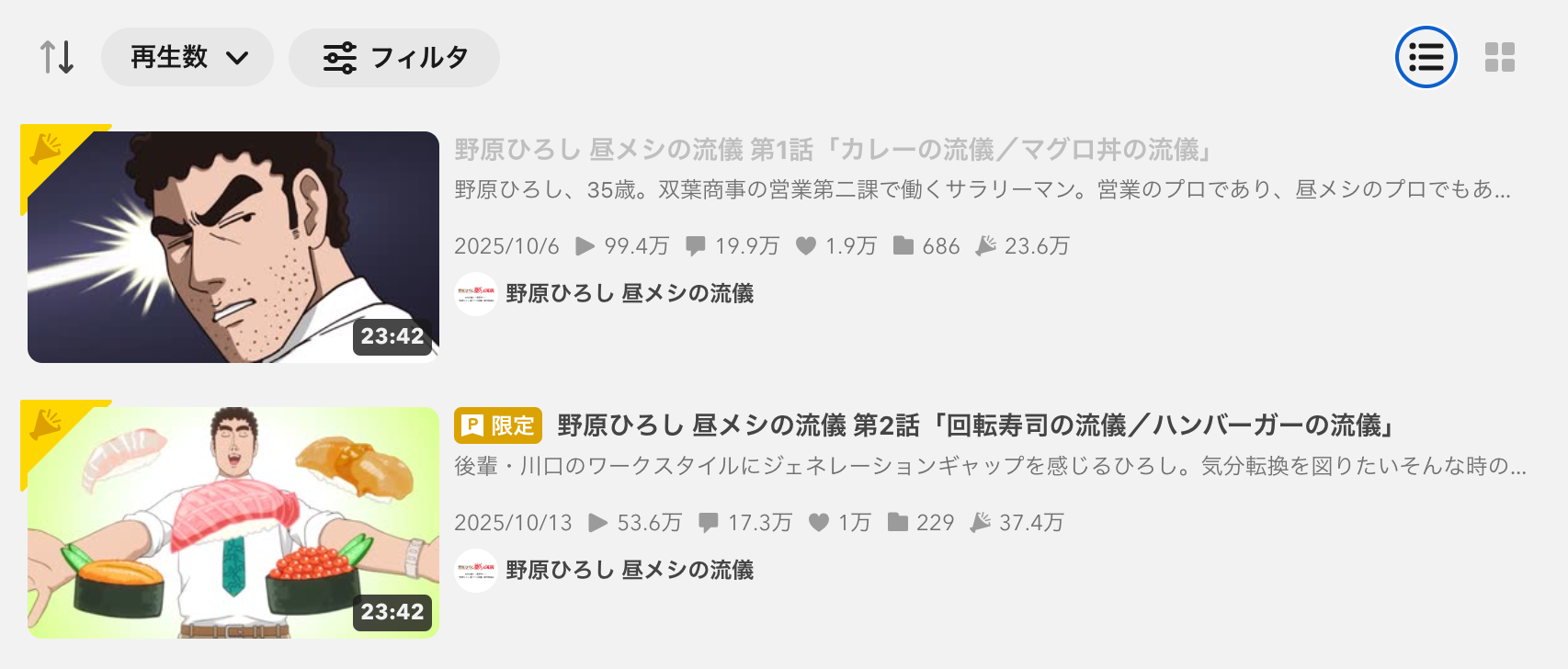 官方也於日本國內最大影音平台niconico開放會員收看。截至2025年10月21日已獲得近百萬次播放與二十萬則留言彈幕,在秋季動畫排行中更是保持數日冠軍之姿。以往niconico上的影片若能獲得十萬播放已算是熱門作品,百萬級別觀看數更代表《野原廣志 午餐的流派》已成為現象級話題。