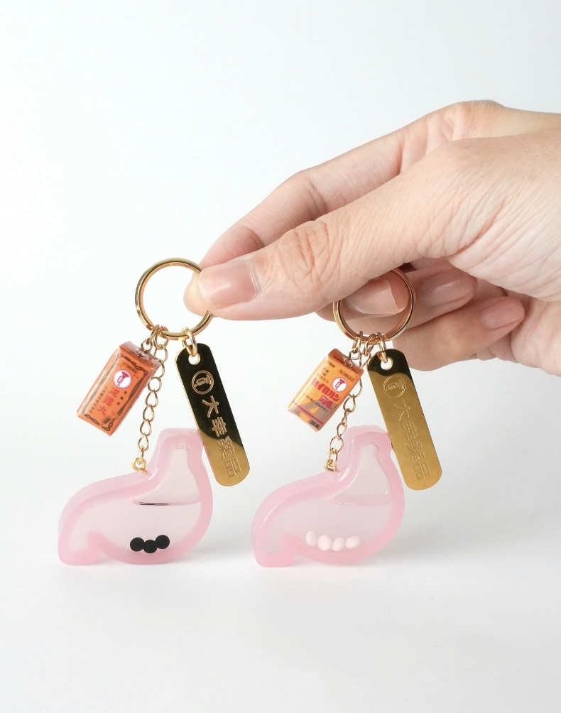 可以發現到「服下正露丸後的胃」這款吊飾,殘留在胃部當中的正是與正露丸一模一樣的黑色小藥丸,吊飾旁邊還有加上正露丸藥品的微型包裝作點綴,以及標上「大幸藥品」四個字的品牌金屬掛牌。