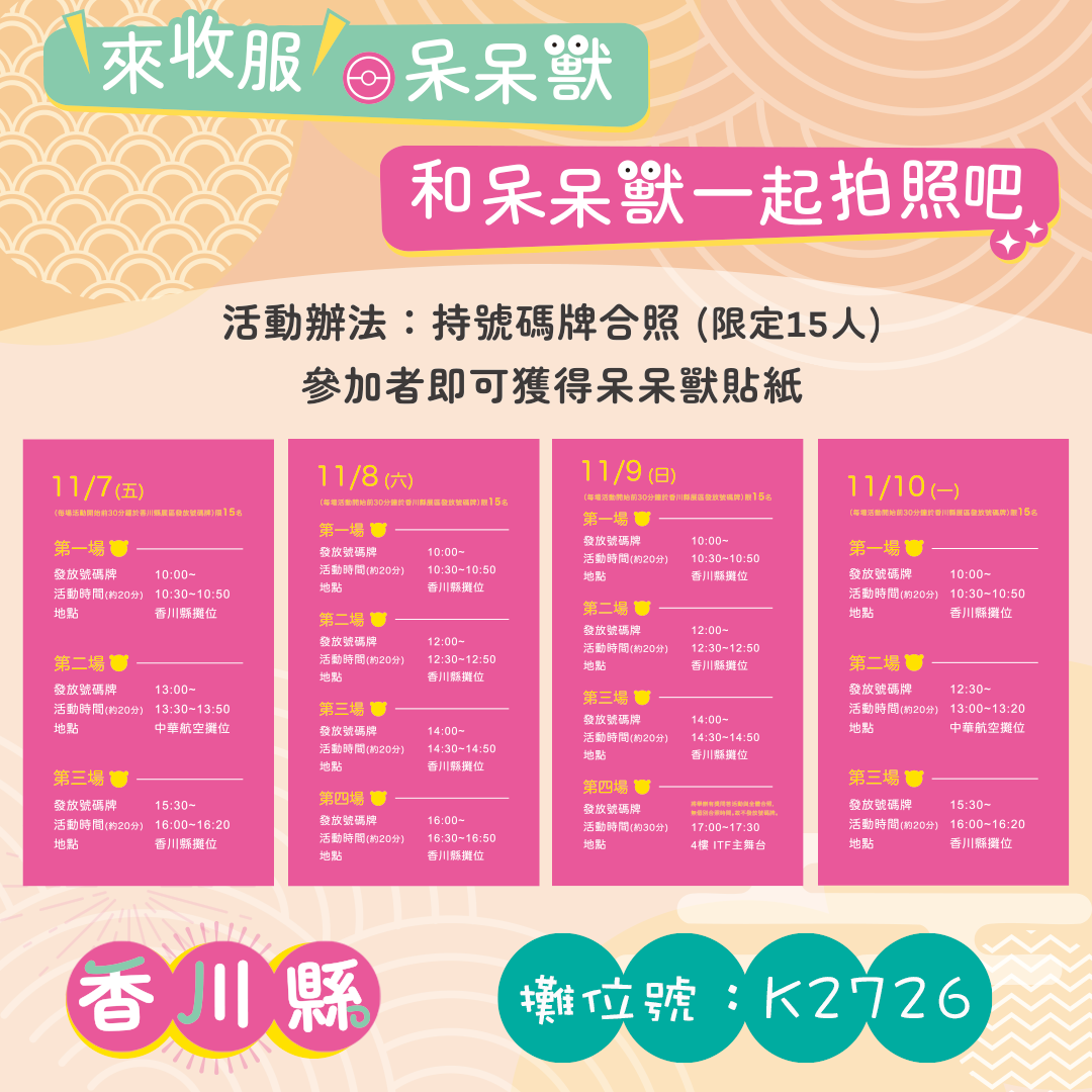 活動期間,香川縣展區將舉辦【來收服呆呆獸!一起來和呆呆獸拍照吧】活動,現場民眾可與呆呆獸近距離互動並合影留念。