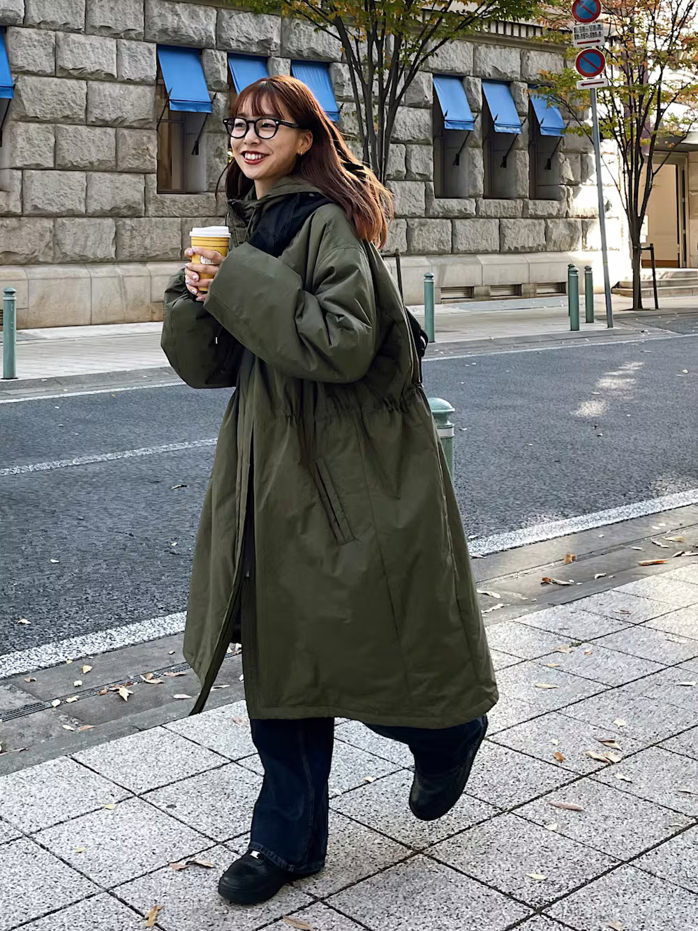 關東地方穿搭範例03:鋪棉外套 + 百褶中長裙