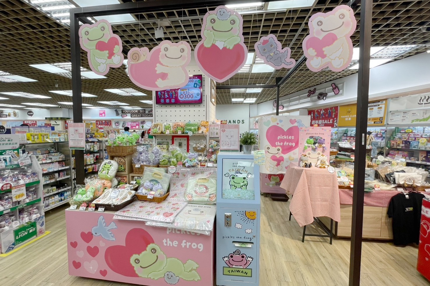 「萌蛙匹克SMILE Heart」快閃店,2026年1月12日前於台隆手創館京站店三樓獨家開賣,pickles the frog周邊生活商品種類非常豐富,絨毛造型娃娃、實用生活小物、鑰匙圈等,不同於日本的台灣專屬限定商品。