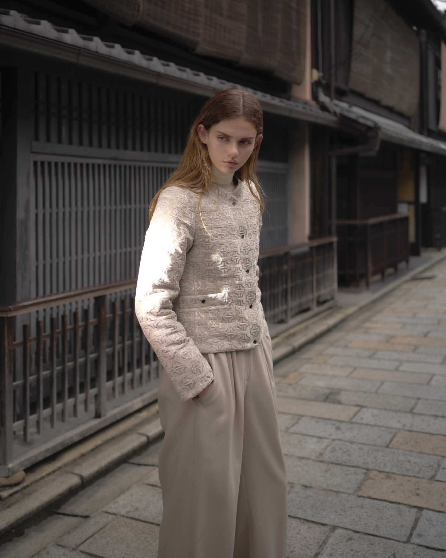 2025年慶祝TATRAS 銀座店一週年,推出與京都老字號織品品牌 【HOSOO(細尾)】 特製布料打造的京都西陣織限量羽絨系列,結合「山脈」與「家紋」意象,展現傳統工藝與現代美學的品牌世界觀。