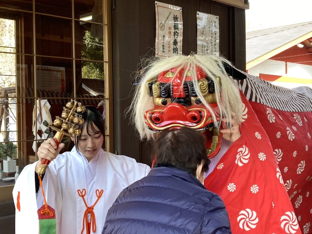將頭伸向獅子的嘴讓它「咬一下」,據說即可保佑新的一年無病無災。(圖文提供:HIT廣島縣觀光聯盟)