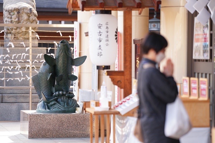 護國神社有兩座鯉魚雕像,可在心中許願並撫摸魚身,祈求保佑願望成真。(圖文提供:HIT廣島縣觀光聯盟)