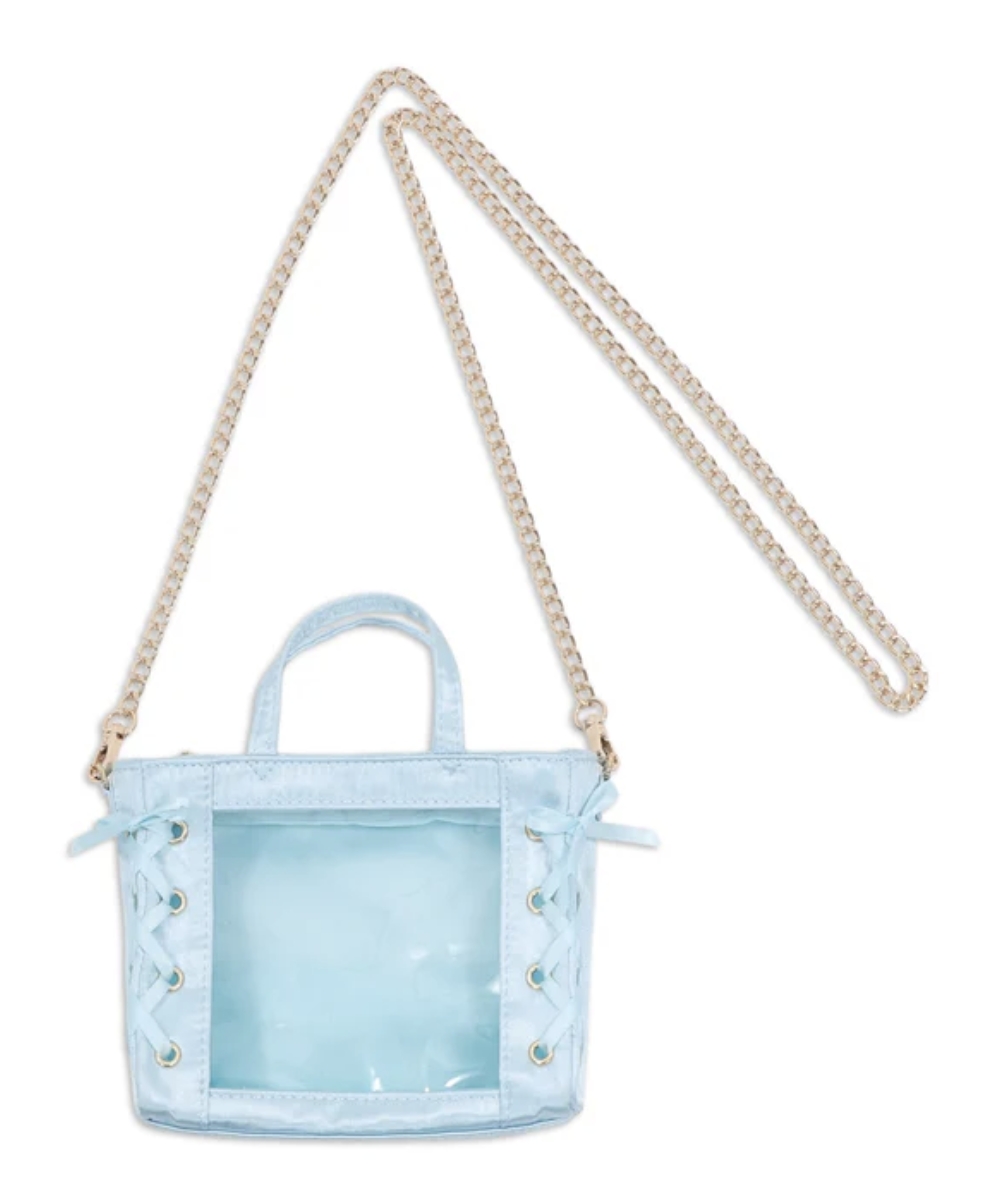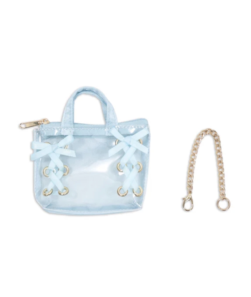 側背包同樣也有正面透明開窗設計,包包周圍還有緞帶蝴蝶結點綴,附上的金屬背鏈為可拆式設計,也可以自行替換背帶。這款側背包適合放入的娃娃尺寸也是10公分娃。