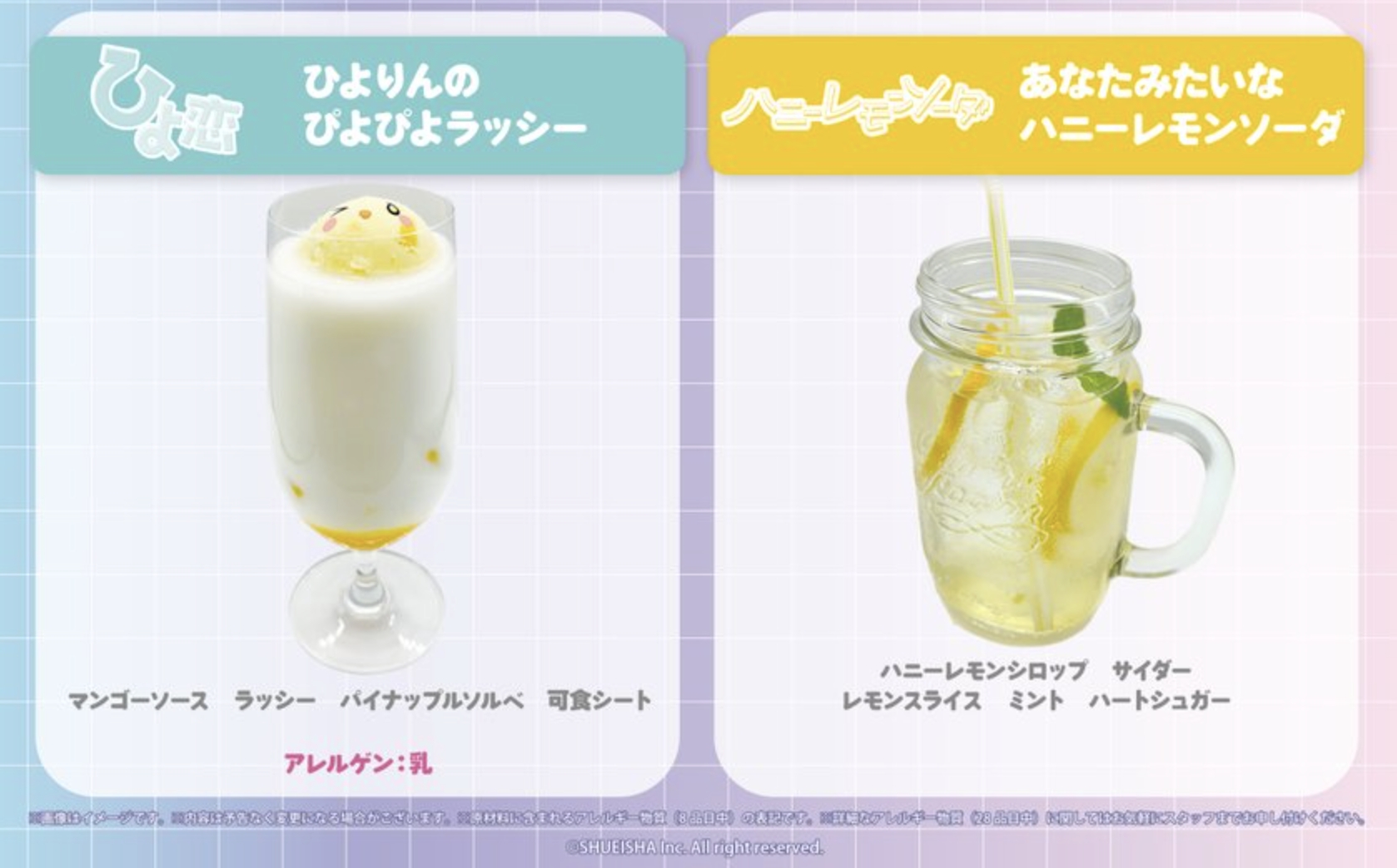 餐點本身雖然沒有視覺上強烈的造型性,但卻有著融入作品形象的代表意涵等,頗值得玩味。舉例來說,在後半期登場的飲品菜單當中,有以《小雞之戀》這部作品的女主角為形象而設計的可愛小雞造型芒果優格奶昔(餐點名稱:ひよりんのぴよぴよラッシー),還有非常符合《青春特調蜂蜜檸檬蘇打》這部作品、名副其實的「蜂蜜檸檬汽水」(餐點名稱:あなたみたいなハニーレモンソーダ)。