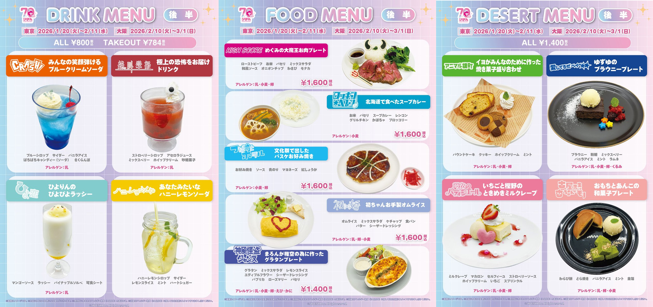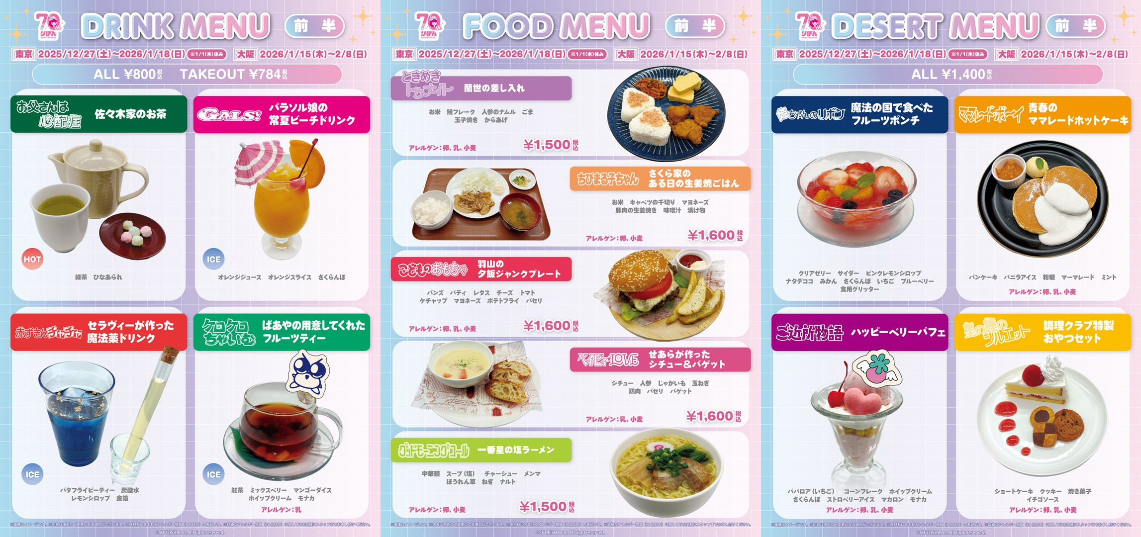 在這次咖啡廳所提供的餐點,都是以該作品為主題去設計與命名,前半期有代表《お父さんは心配症》、《GALS!辣妹壽蘭》、《小紅帽恰恰》、《呱呱響叮噹》這四部作品的4款飲品,代表《心跳在今夜》、《櫻桃小丸子》、《玩偶遊戲》、《娃娃★愛你》、《Good Morning Call 愛情起床號》這五部作品的5款主食,以及代表《緞帶魔法姬》、《橘子醬男孩》、《芳鄰物語》、《星の瞳のシルエット》這四部作品的4款甜點。