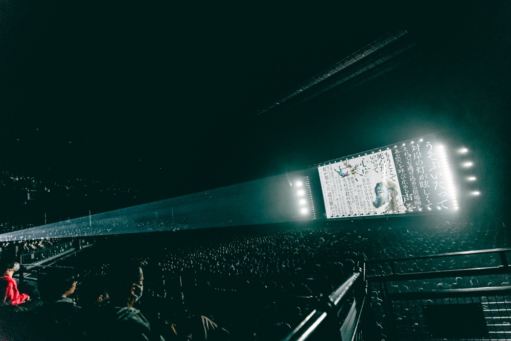 接著在 2010 年的經典曲〈たられば〉,紗幕上投影出秋田手寫的字跡,像是寫給每位觀眾討論煩惱的私密密信箋,探討著若人生能重來、若自己更有才華等「如果的話」,不甘與懊悔,讓人不禁共鳴,也讓許多觀眾在台下默默流淚。