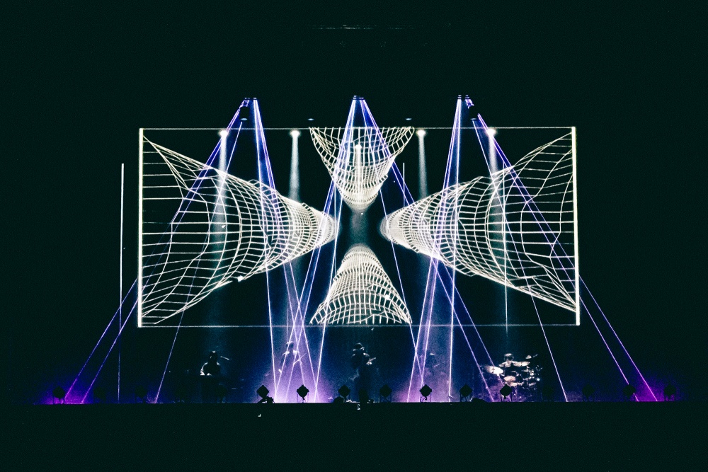 〈ナイトメア〉的影像中,水藍色的三角幾何圖形不斷變換,巨大的文字投影在幕簾邊緣,展現出極具衝擊力的視覺效果。緊接著的〈黎明期〉,影像從黑白逐漸轉為帶有色彩的虹色光芒,將氣氛從黑白的惡夢逐漸轉化為帶有色彩的畫面,曲目編排巧妙地呈現出從惡夢中掙扎並重新奪回色彩的激昂過程。